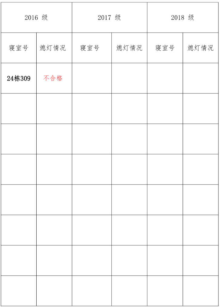 为改正各种不良现象和陋习,增强宿舍学习氛围,营造温馨家园氛围,英国正版365官方网站学生会生活部对三个年级所有寝室进行熄灯检查。本次熄灯情况通报不合格寝室 1 间,具体情况如下:
