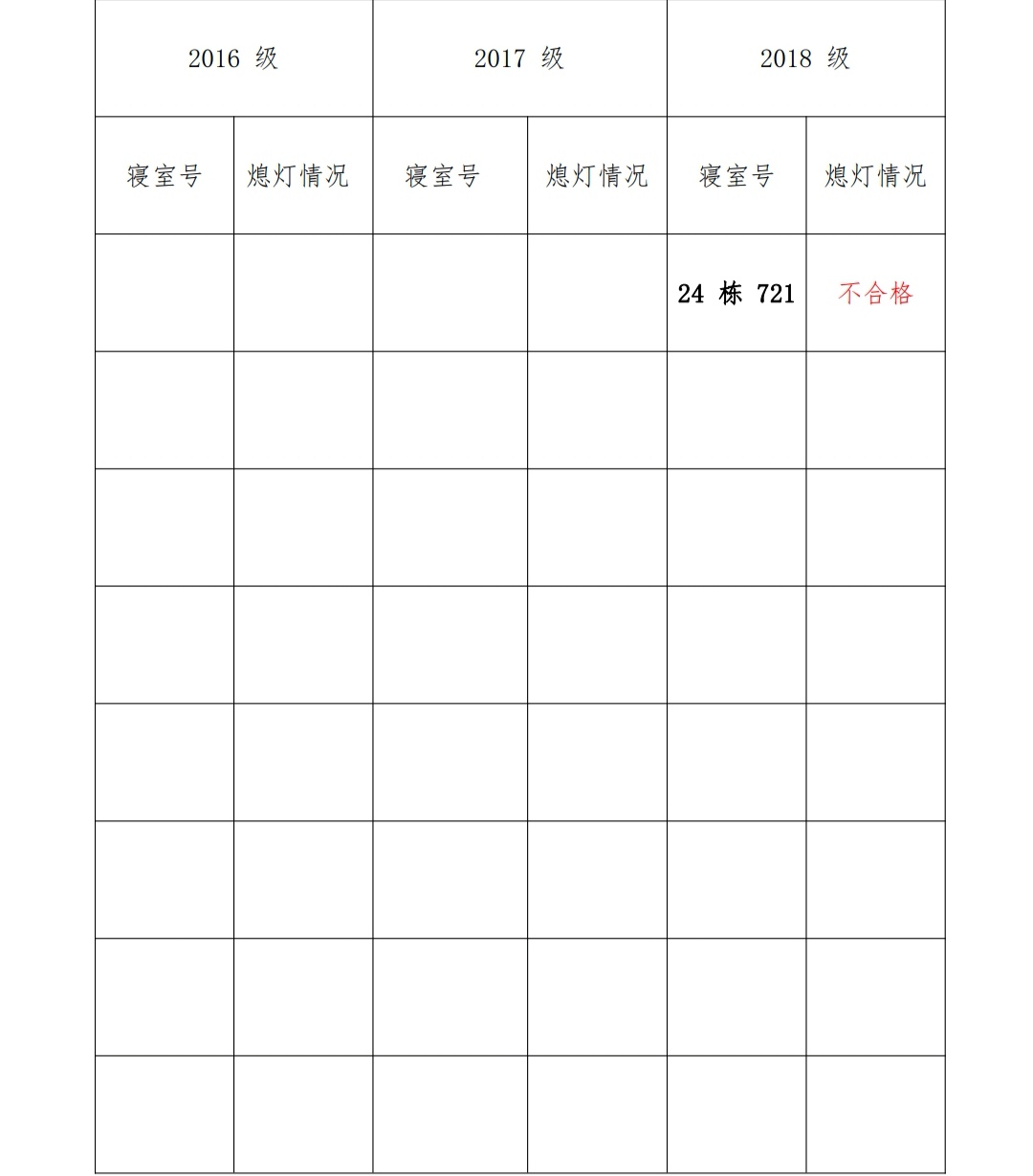 为改正各种不良现象和陋习,增强宿舍学习氛围,营造温馨家园氛围,化学化工学院学生会生活部对三个年级所有寝室进行熄灯检查。本次熄灯情况通报不合格寝室1 间,具体情况如下: