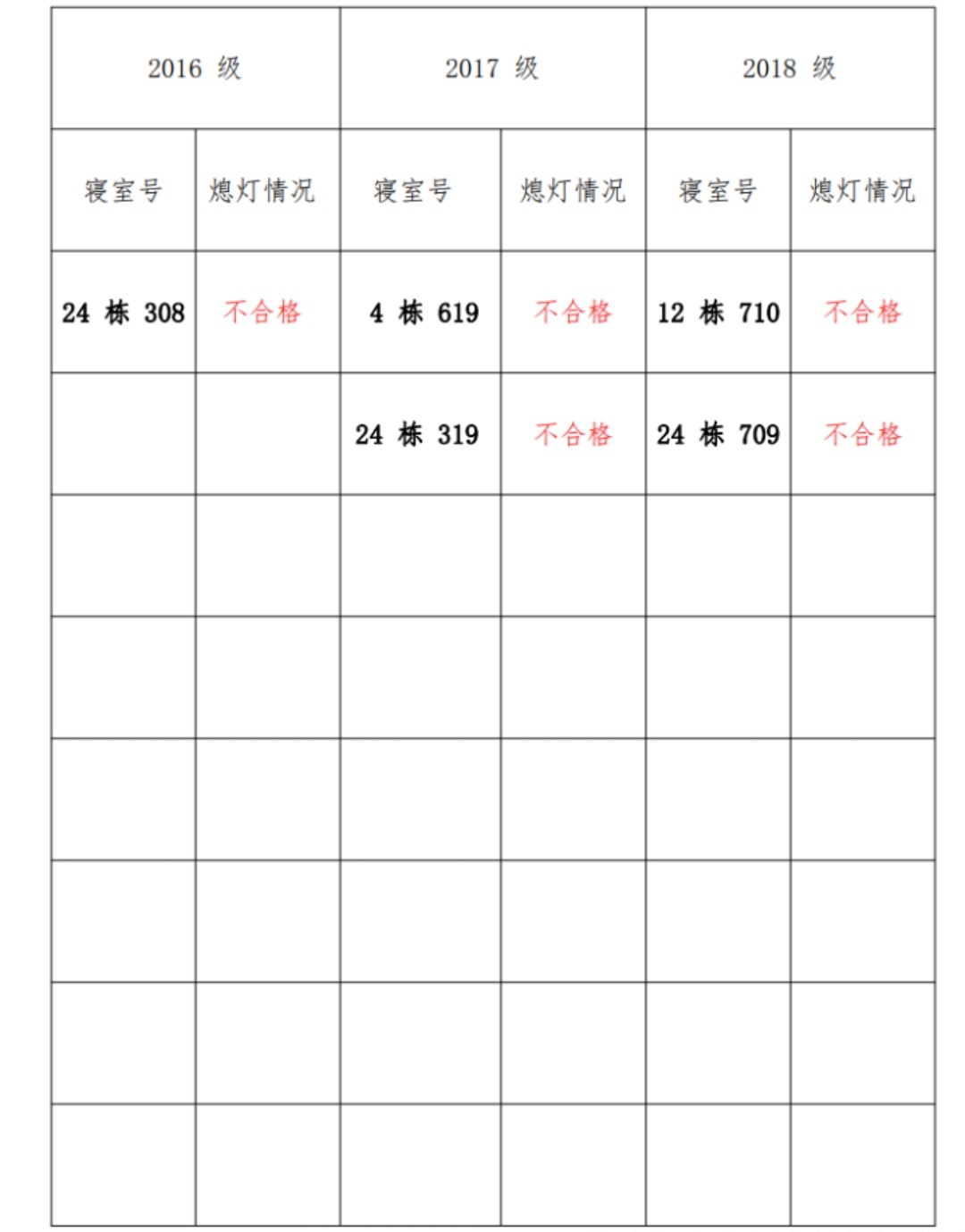 为改正各种不良现象和陋习,增强宿舍学习氛围,营造温馨家园氛围,化学化工学院学生会生活部对三个年级所有寝室进行熄灯检查。本次熄灯情况通报不合格寝室 5 间,具体情况如下: