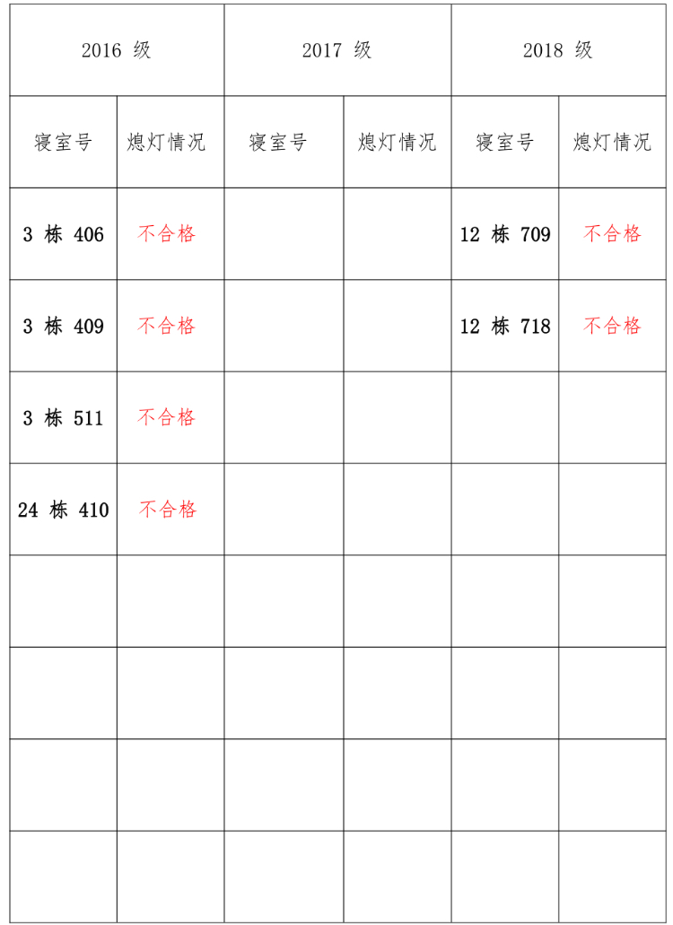 为改正各种不良现象和陋习,增强宿舍学习氛围,营造温馨家园氛围,英国正版365官方网站学生会生活部对三个年级所有寝室进行熄灯检查。本次熄灯情况通报不合格寝室 6 间,具体情况如下:
