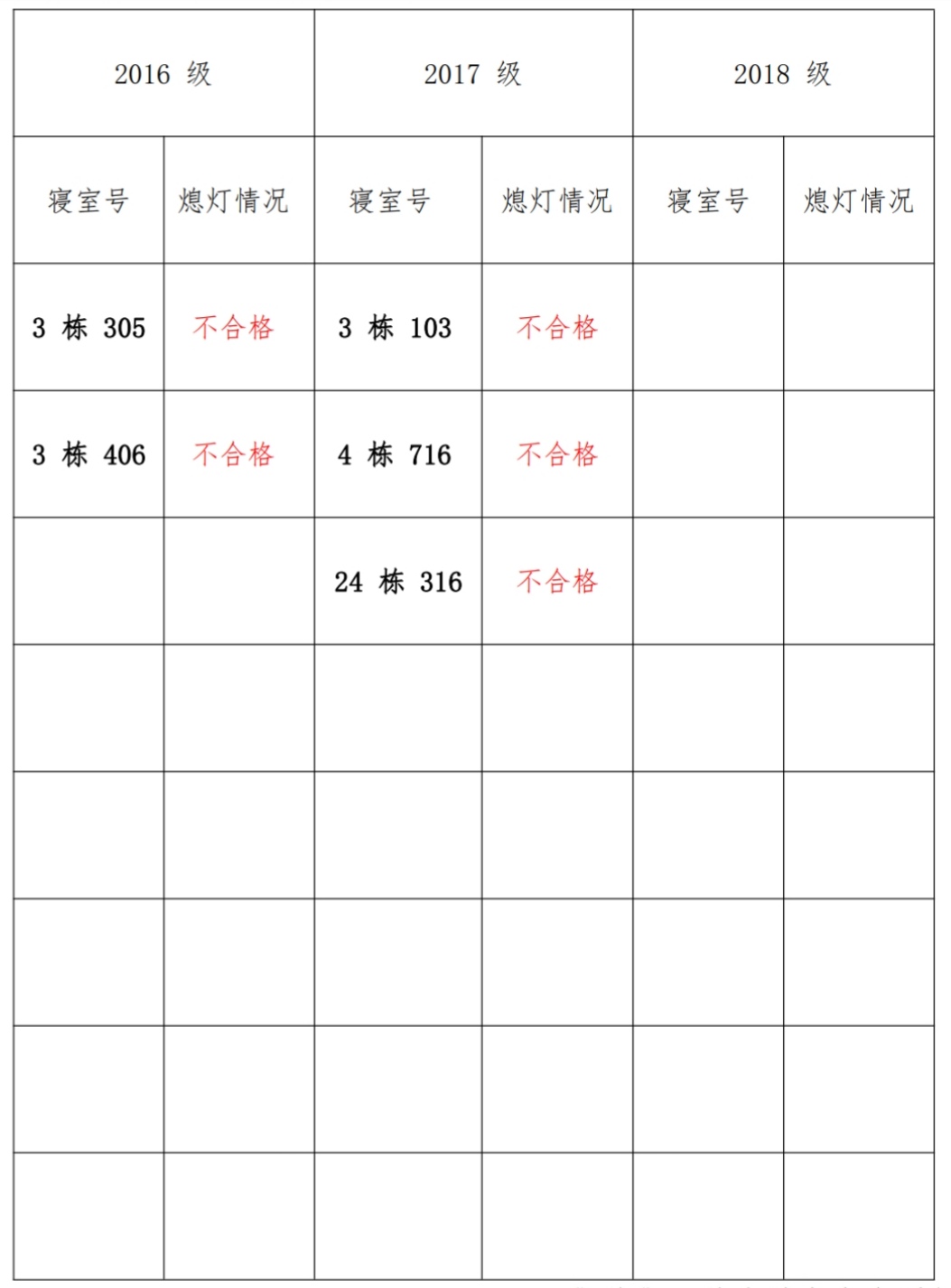 为改正各种不良现象和陋习,增强宿舍学习氛围,营造温馨家园氛围,英国正版365官方网站学生会生活部对三个年级所有寝室进行熄灯检查。本次熄灯情况通报不合格寝室 5 间,具体情况如下: