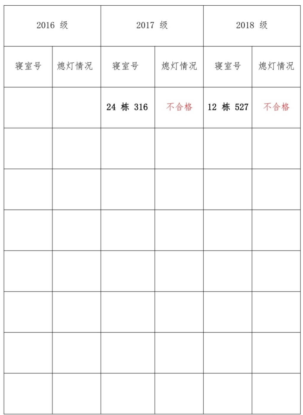 为改正各种不良现象和陋习,增强宿舍学习氛围,营造温馨家园氛围,英国正版365官方网站学生会生活部对三个年级所有寝室进行熄灯检查。本次熄灯情况通 报不合格寝室 2 间,具体情况如下: