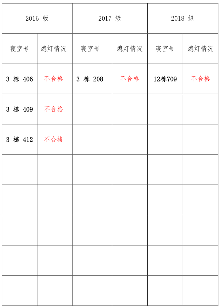 为改正各种不良现象和陋习,增强宿舍学习氛围,营造温馨家园氛围,英国正版365官方网站学生会生活部对三个年级所有寝室进行熄灯检查。本次熄灯情况通 报不合格寝室 5 间,具体情况如下: