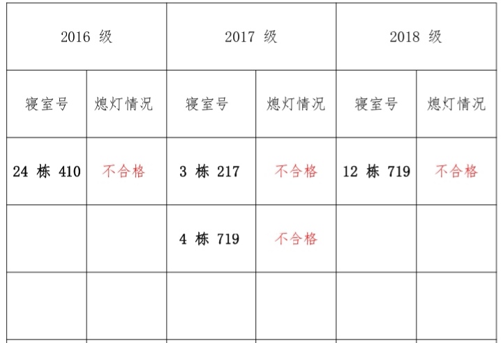 为改正各种不良现象和陋习,增强宿舍学习氛围,营造温馨家园氛围,化 学化工学院学生会生活部对三个年级所有寝室进行熄灯检查。本次熄灯情况通 报不合格寝室 4 间,具体情况如下: