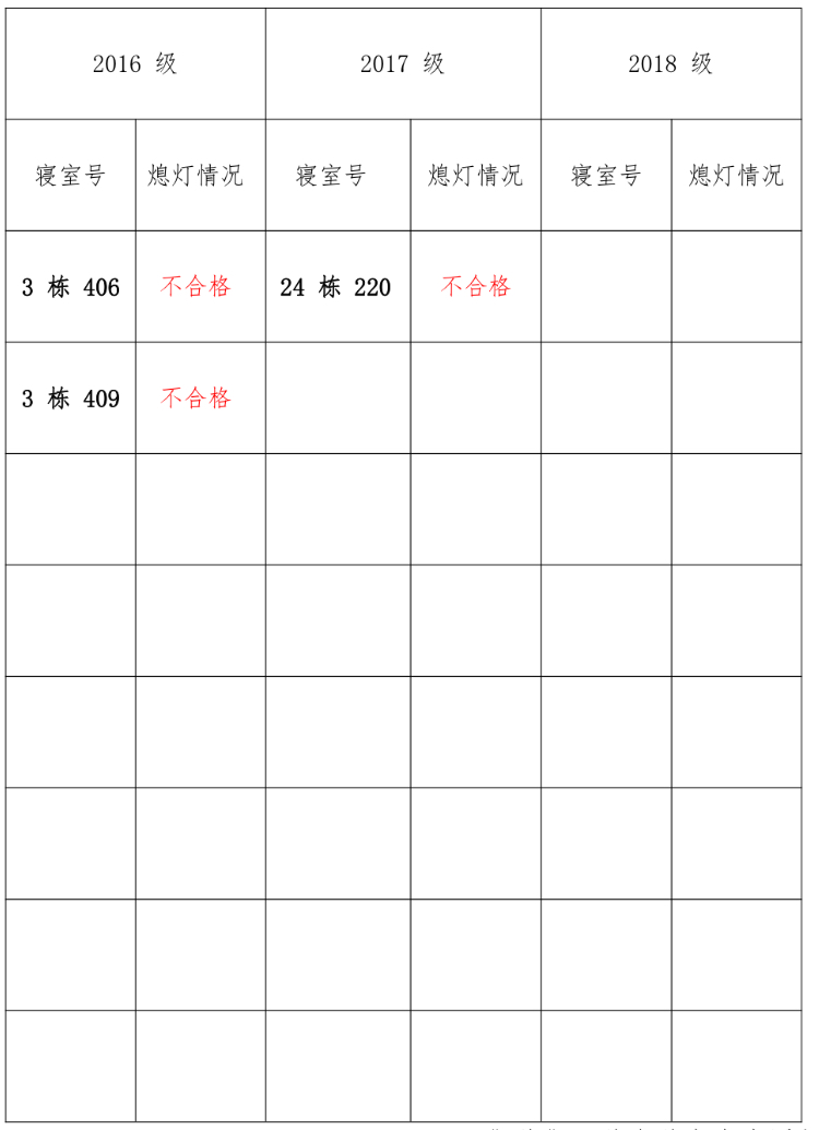 为改正各种不良现象和陋习,增强宿舍学习氛围,营造温馨家园氛围,化 学化工学院学生会生活部对三个年级所有寝室进行熄灯检查。本次熄灯情况通 报不合格寝室 3 间,具体情况如下: