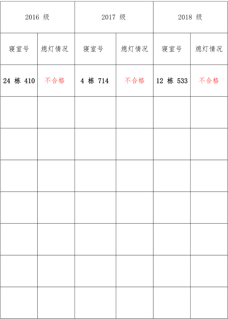为改正各种不良现象和陋习,增强宿舍学习氛围,营造温馨家园氛围,英国正版365官方网站学生会生活部对三个年级所有寝室进行熄灯检查。本次熄灯情况通 报不合格寝室 3 间,具体情况如下: