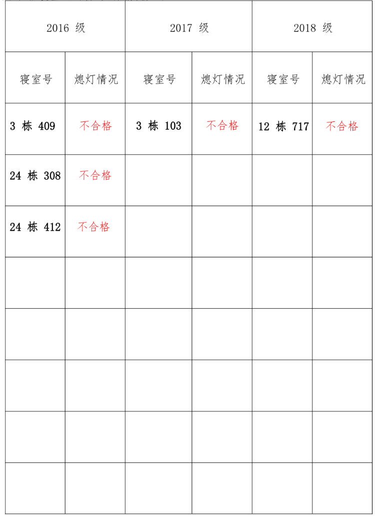 为改正各种不良现象和陋习,增强宿舍学习氛围,营造温馨家园氛围,化 学化工学院学生会生活部对三个年级所有寝室进行熄灯检查。本次熄灯情况通 报不合格寝室 5 间,具体情况如下: