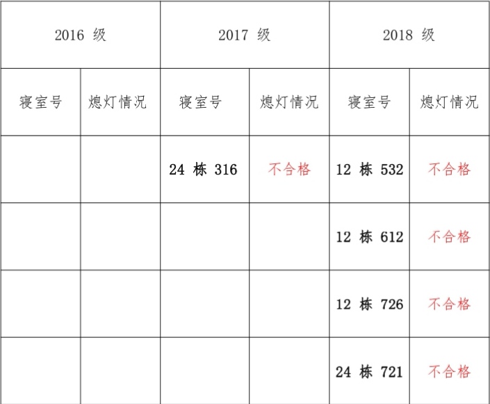 为改正各种不良现象和陋习,增强宿舍学习氛围,营造温馨家园氛围,英国正版365官方网站学生会生活部对三个年级所有寝室进行熄灯检查。 本次熄灯情况通报不合格寝室 5 间,具体情况如下: