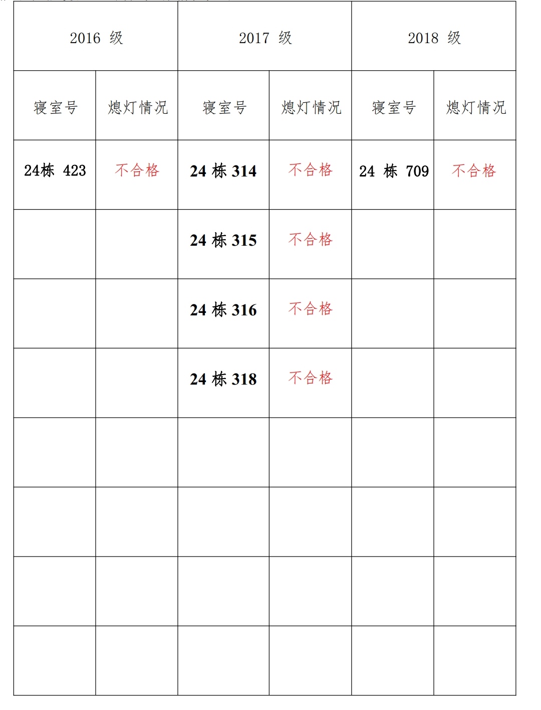为改正各种不良现象和陋习,增强宿舍学习氛围,营造温馨家园氛围,英国正版365官方网站学生会生活部对三个年级所有寝室进行熄灯检查。 本次熄灯情况通报不合格寝室 6 间,具体情况如下: