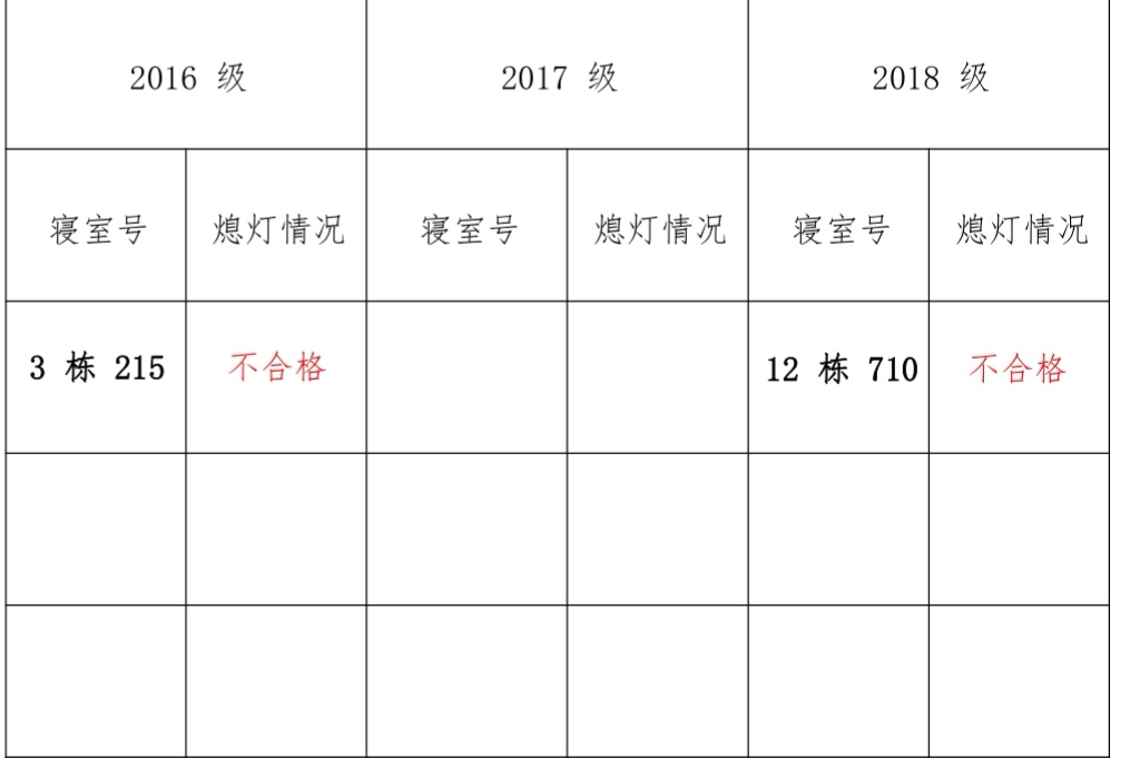 为改正各种不良现象和陋习,增强宿舍学习氛围,营造温馨家园氛围,化学化工学院学生会生活部对三个年级所有寝室进行熄灯检查。本次熄灯情况通报不合格寝室 6 间,具体情况如下: