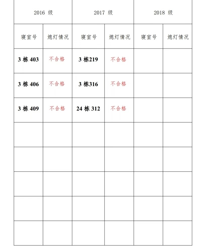 为改正各种不良现象和陋习,增强宿舍学习氛围,营造温馨家园氛围,英国正版365官方网站学生会生活部对三个年级所有寝室进行熄灯检查。 本次熄灯情况通报不合格寝室 6 间,具体情况如下: