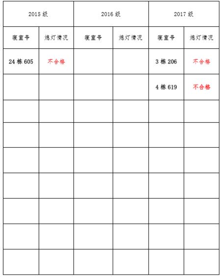 为改正各种不良现象和陋习,增强宿舍学习氛围,营造温馨家园氛围,英国正版365官方网站学生会生活部对三个年级所有寝室进行熄灯检查。 本次熄灯情况通报不合格寝室 3 间,具体情况如下: