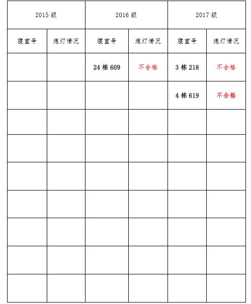 为改正各种不良现象和陋习,增强宿舍学习氛围,营造温馨家园氛围,英国正版365官方网站学生会生活部对三个年级所有寝室进行熄灯检查。 本次熄灯情况通报不合格寝室 3 间,具体情况如下: