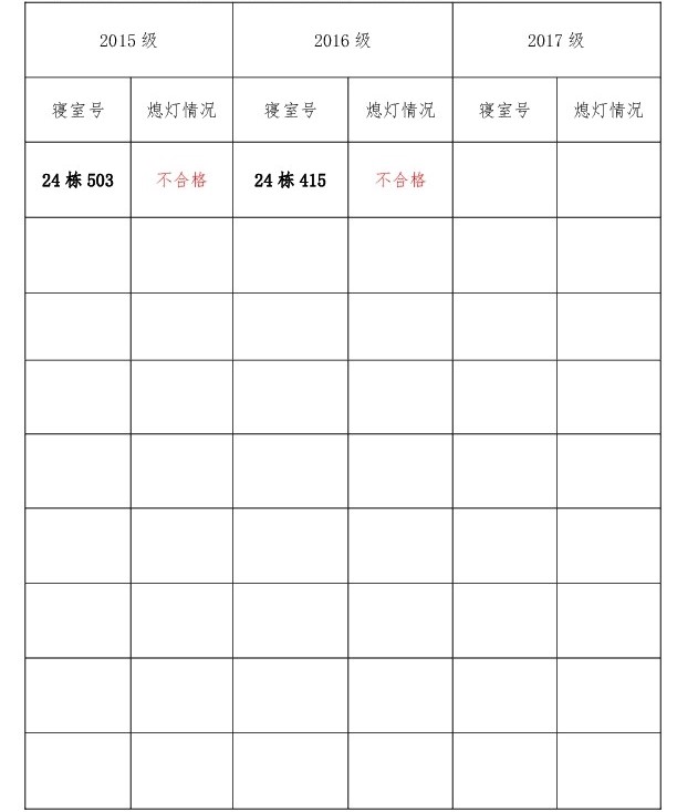 为改正各种不良现象和陋习,增强宿舍学习氛围,营造温馨家园氛围,英国正版365官方网站团委学生会生活权益服务部对三个年级所有寝室进行熄灯检查。本次熄灯情况通报不合格寝室2间,具体情况如下: