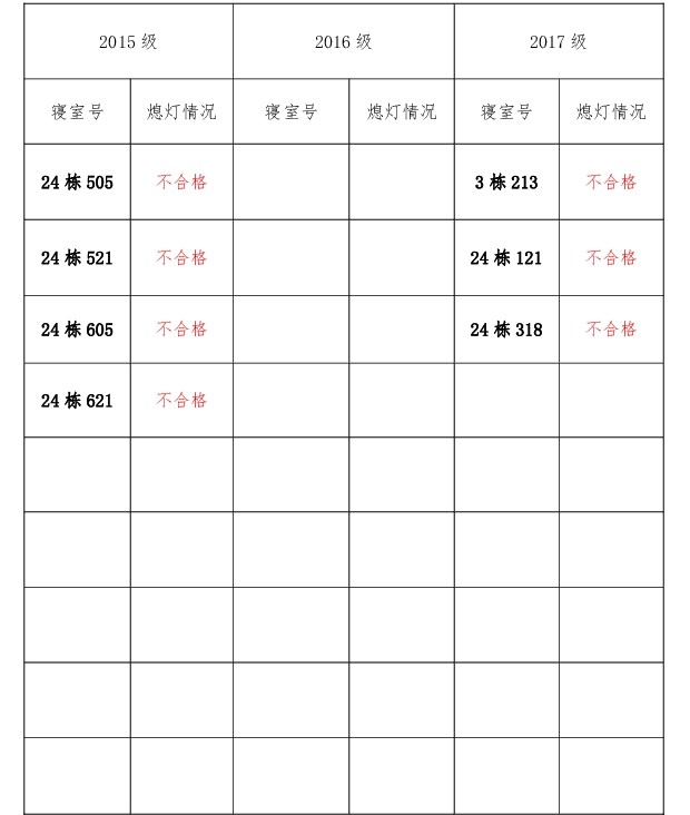 为改正各种不良现象和陋习,增强宿舍学习氛围,营造温馨家园氛围,英国正版365官方网站团委学生会生活权益服务部对三个年级所有寝室进行熄灯检查。本次熄灯情况通报不合格寝室7间,具体情况如下: