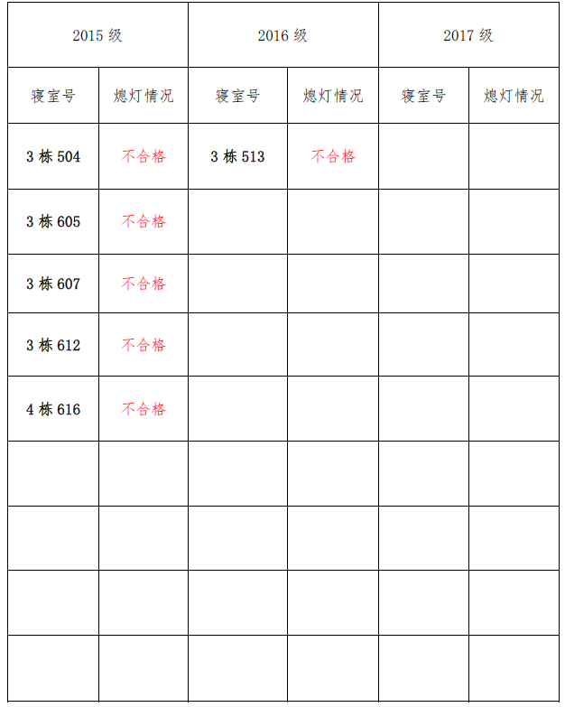 为改正各种不良现象和陋习,增强宿舍学习氛围,营造温馨家园氛围,英国正版365官方网站团委学生会生活权益服务部对三个年级所有寝室进行熄灯检查。本次熄灯情况通报不合格寝室6间,具体情况如下:
