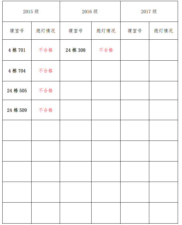 为改正各种不良现象和陋习,增强宿舍学习氛围,营造温馨家园氛围,英国正版365官方网站团委学生会生活权益服务部对三个年级所有寝室进行熄灯检查。本次熄灯情况通报不合格寝室5间,具体情况如下: