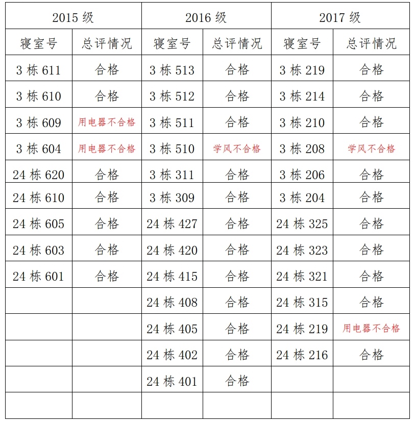 为改正各种不良现象和陋习,增强宿舍学习氛围,营造温馨家园氛围,英国正版365官方网站团委学生会生活部对各年级部分寝室进行检查。本次查寝共检查寝室数 34 间,5 间寝室不合格。所查寝室总评情况如下: