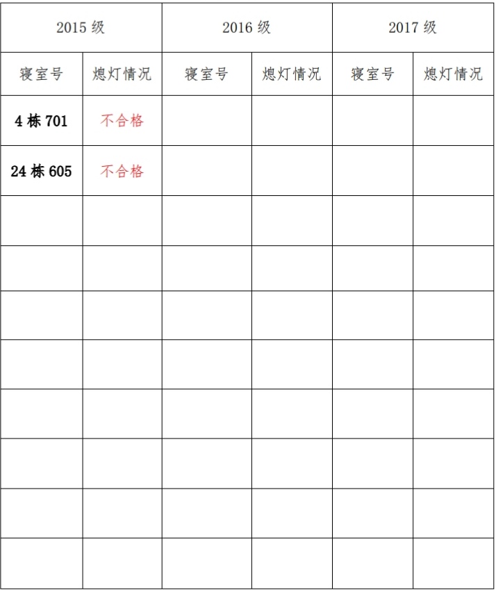 为改正各种不良现象和陋习,增强宿舍学习氛围,营造温馨家园 氛围,英国正版365官方网站学生会生活部对三个年级所有寝室进行熄灯检查。本次熄灯情况通报不合格寝室 2 间,具体情况如下: