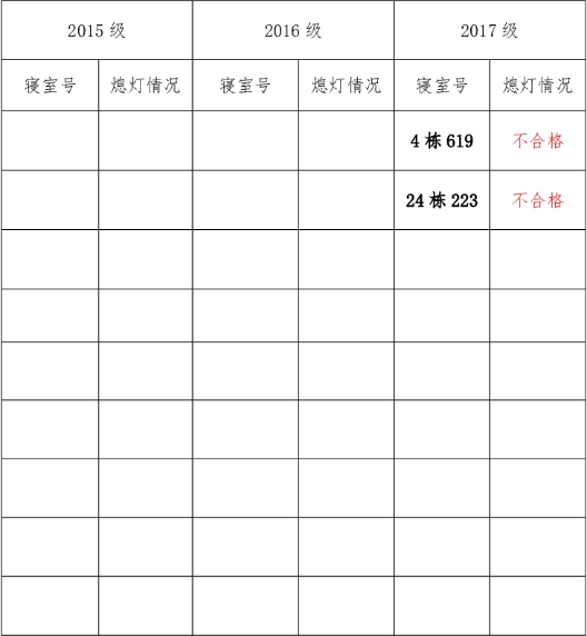 为改正各种不良现象和陋习,增强宿舍学习氛围,营造温馨家园氛围,英国正版365官方网站团委学生会生活权益服务部对三个年级所有寝室进行熄灯检查。本次熄灯情况通报不合格寝室2间,具体情况如下: