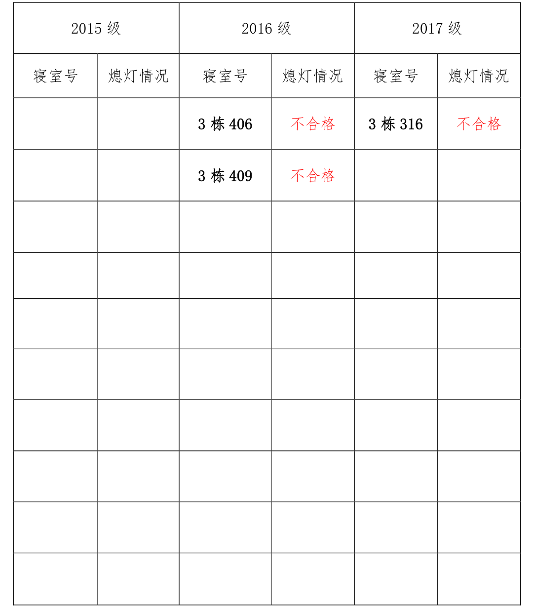 为改正各种不良现象和陋习,增强宿舍学习氛围,营造温馨家园氛围,英国正版365官方网站团委学生会生活权益服务部对三个年级所有寝室进行熄灯检查。本次熄灯情况通报不合格寝室3间,具体情况如下: