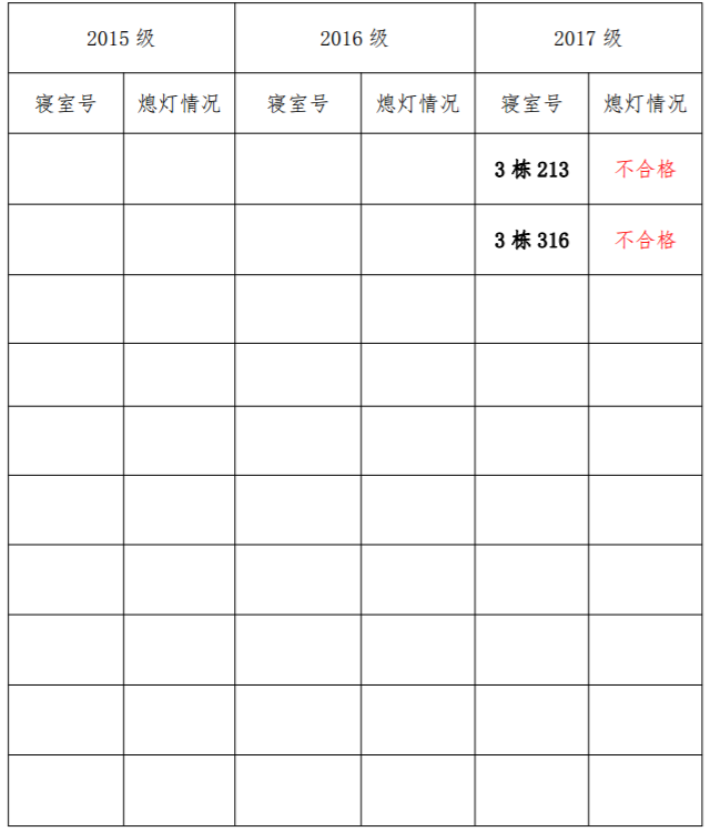 为改正各种不良现象和陋习,增强宿舍学习氛围,营造温馨家园氛围,英国正版365官方网站团委学生会生活权益服务部对三个年级所有寝室进行熄灯检查。本次熄灯情况通报不合格寝室2间,具体情况如下: