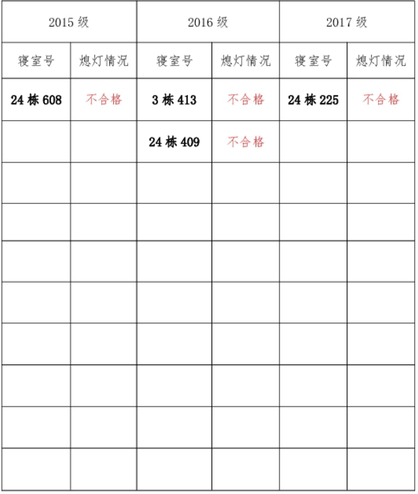 为改正各种不良现象和陋习,增强宿舍学习氛围,营造温馨家园氛围,英国正版365官方网站团委学生会生活权益服务部对三个年级所有寝室进行熄灯检查。本次熄灯情况通报不合格寝室4间,具体情况如下: