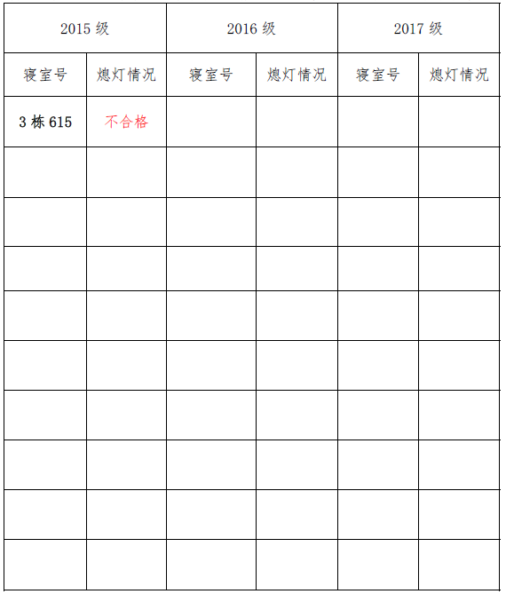 为改正各种不良现象和陋习,增强宿舍学习氛围,营造温馨家园氛围,英国正版365官方网站团委学生会生活权益服务部对三个年级所有寝室进行熄灯检查。本次熄灯情况通报不合格寝室1间,具体情况如下: