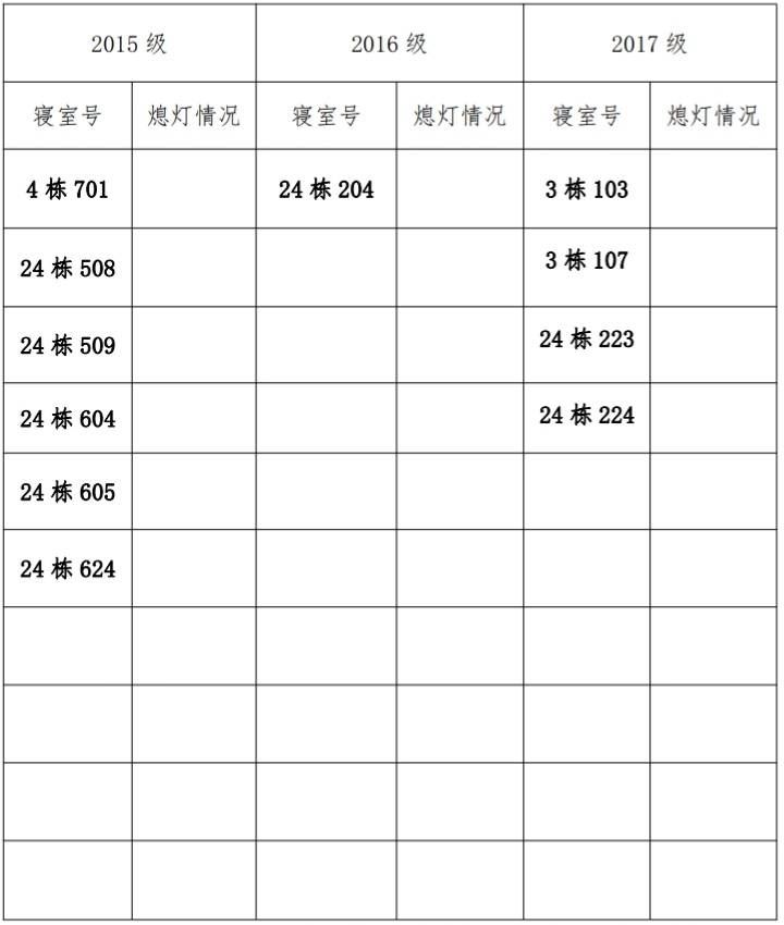 为改正各种不良现象和陋习,增强宿舍学习氛围,营造温馨家园氛围,英国正版365官方网站团委学生会生活权益服务部对三个年级所有寝室进行熄灯检查。本次熄灯情况通报不合格寝室 11 间,具体情况如下: