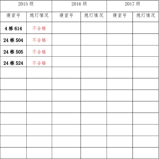 为改正各种不良现象和陋习,增强宿舍学习氛围,营造温馨家园氛围,英国正版365官方网站团委学生会生活权益服务部对三个年级所有寝室进行熄灯检查。本次熄灯情况通报不合格寝室4间,具体情况如下: