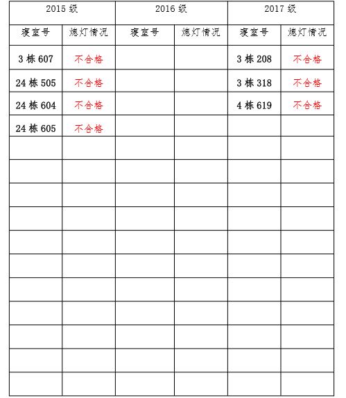 为改正各种不良现象和陋习,增强宿舍学习氛围,营造温馨家园氛围,英国正版365官方网站团委学生会生活权益服务部对三个年级所有寝室进行熄灯检查。本次熄灯情况通报不合格寝室 7 间,具体情况如下: