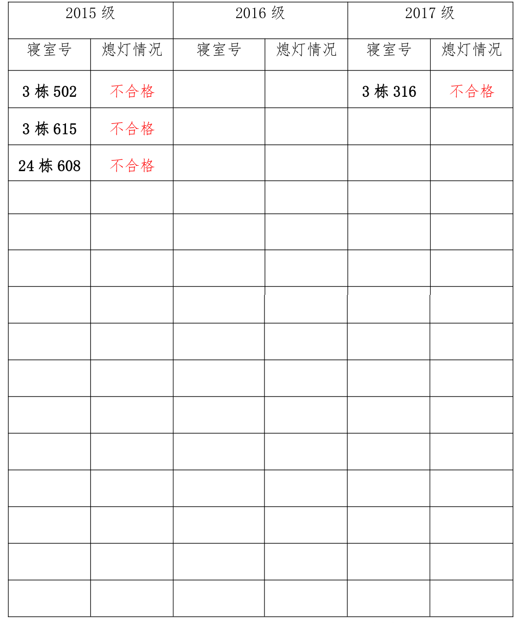 为改正各种不良现象和陋习,增强宿舍学习氛围,营造温馨家园氛围,英国正版365官方网站团委学生会生活权益服务部对三个年级所有寝室进行熄灯检查。本次熄灯情况通报不合格寝室4间,具体情况如下: