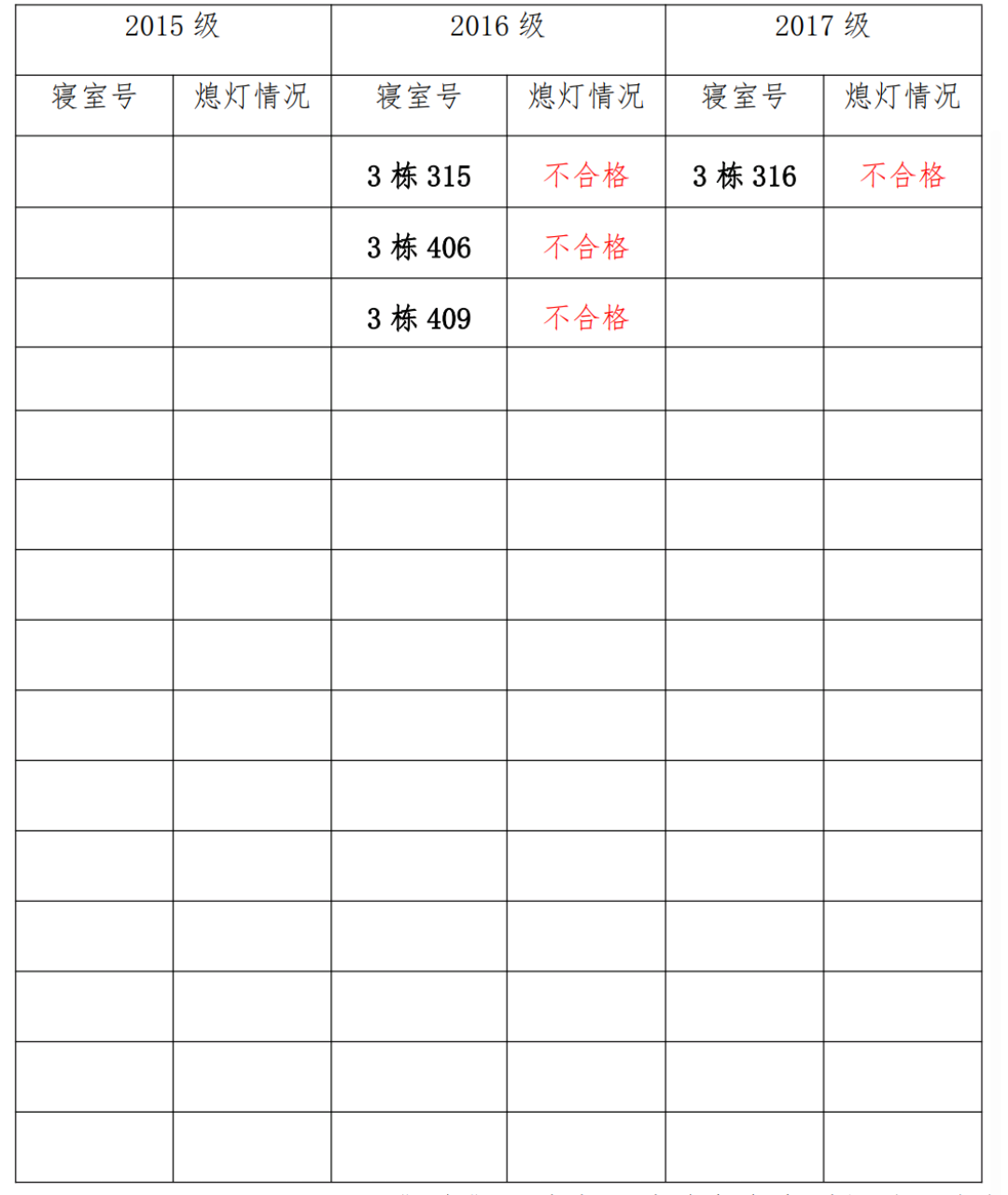 为改正各种不良现象和陋习,增强宿舍学习氛围,营造温馨家园氛围,英国正版365官方网站团委学生会生活权益服务部对三个年级所有寝室进行熄灯检查。本次熄灯情况通报不合格寝室4间,具体情况如下: