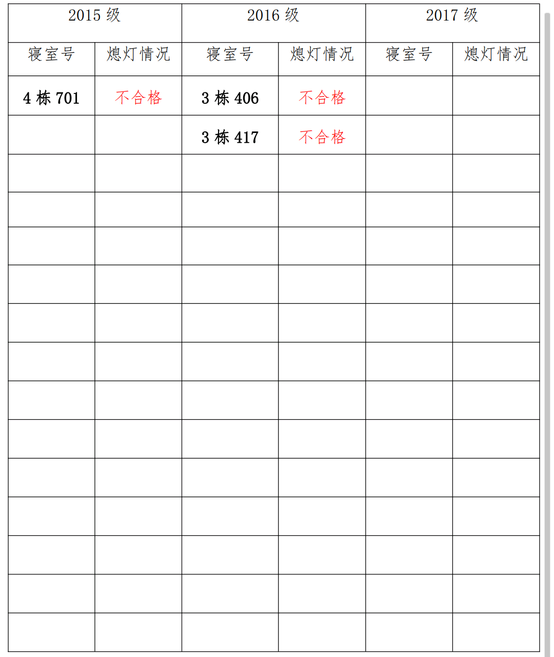 为改正各种不良现象和陋习,增强宿舍学习氛围,营造温馨家园氛围,英国正版365官方网站团委学生会生活权益服务部对三个年级所有寝室进行熄灯检查。本次熄灯情况通报不合格寝室3间,具体情况如下: