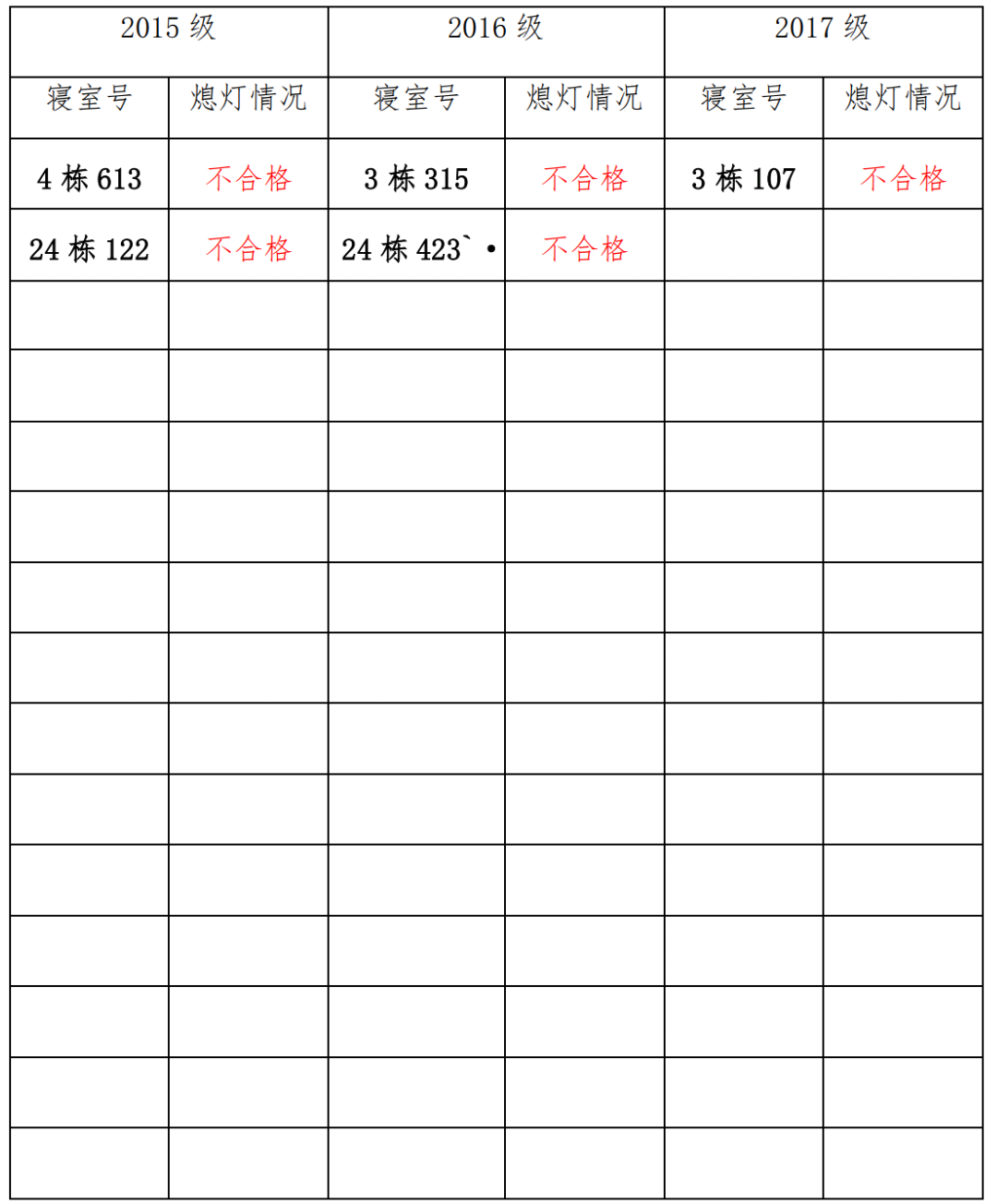 为改正各种不良现象和陋习,增强宿舍学习氛围,营造温馨家园氛围,英国正版365官方网站团委学生会生活权益服务部对三个年级所有寝室进行熄灯检查。本次熄灯情况通报不合格寝室 5间,具体情况如下: