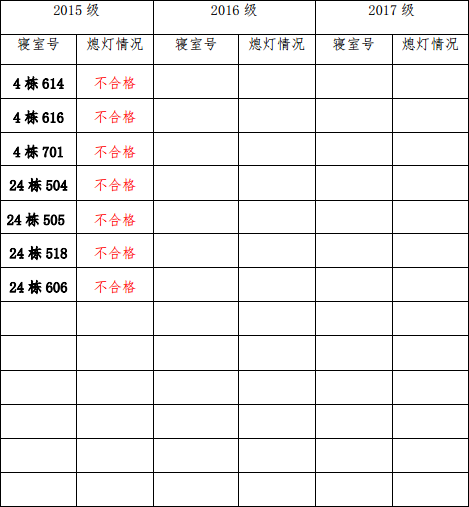 为改正各种不良现象和陋习,增强宿舍学习氛围,营造温馨家园氛围,英国正版365官方网站团委学生会生活权益服务部对三个年级所有寝室进行熄灯检查。本次熄灯情况通报不合格寝室7间,具体情况如下:
