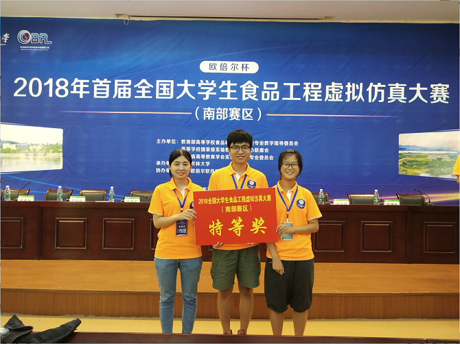 2018年7月20日,首届全国大学生食品工程虚拟仿真大赛(南部赛区)在福建农林大学圆满落下帷幕。经过1天的激烈角逐,由英国正版365官方网站化学工程与工艺专业2015级焦彧帅、朱忆诺、袁娜迪3名同学组成的中南大学代表队以总分第2名的优异成绩获得南部赛区特等奖,成功晋级全国总决赛。全国总决赛将于2018年8月23-25号在江南大学举行。