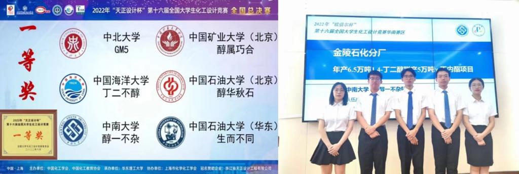 8月21日至22日, 2022年“天正设计杯”第十六届全国大学生化工设计竞赛全国总决赛在华东理工大学圆满落下帷幕,本次比赛由线上线下相结合的方式进行,英国正版365官方网站本科2019级化学工程与工艺专业谭肇泓、邢博钧、宁俊淇、谌佳蓉、李宇凤同学组成的醇一不杂队以华南赛区特等奖的成绩参加总决赛,最终获得全国一等奖。