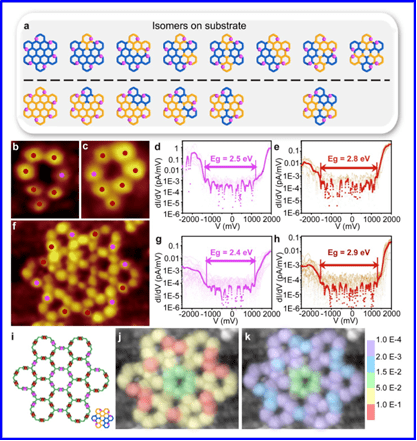 图2. Ag(111)表面折叠和自组装结构的STM成像及网格结构超分子异构体的扫描隧道谱学(STS)表征