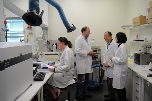 在南澳大学访问期间,南澳大学主管国际与发展事务的副校长Nigel Relph先生,主管信息技术、工程及环境的副校长Simon Beecham教授,以及水资源管理与再利用研究中心 (Centre for Water Management and Re-use) 和环境风险评估与修复研究中心 (Centre for Environmental Risk Assessment & Remediation) 的主任Christopher Saint 教授会见了代表团并表示了热烈的欢迎。双方就各自的研究兴趣、科研状况等方面进行了认真细致的探讨,相互了解了对方近期关注的科研热点,为寻求进一步合作打下了良好的基础。会后,在Christopher Saint 教授的陪同下,代表团参观了环境风险评估与修复中心的实验室、水资源管理与再利用中心的室内及室外人工模拟实验基地。其中,中心实验室为公共实验平台,集中了ICP-MS、LC-MS、GC-MS、连续流动分析仪、荧光定量PCR仪、梯度PCR仪等大量顶尖仪器设备,以及微生物实验室、藻类实验室、无菌操作室等多个功能实验室,涉及分析化学、环境污染化学、微生物学、分子生物学等多个研究领域。此外,实验室标准化的管理模式、高效的运行机制也给代表团留下了深刻的印象。