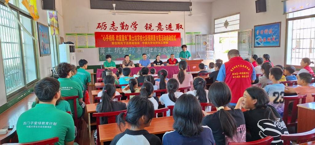 8月3日上午九点,潇湘化工绿教春晖队在黄土坑学校举行开营仪式,正式开启筑梦之旅。此次活动特邀益阳市关心下一代工作委员会主任胡佳男、副主任文潇宇、益阳市赫山区衡龙桥镇黄土坑学校校长杨冰、益阳市爱在阳光下志愿者协会执行会长吴显著及60余名同学参会。